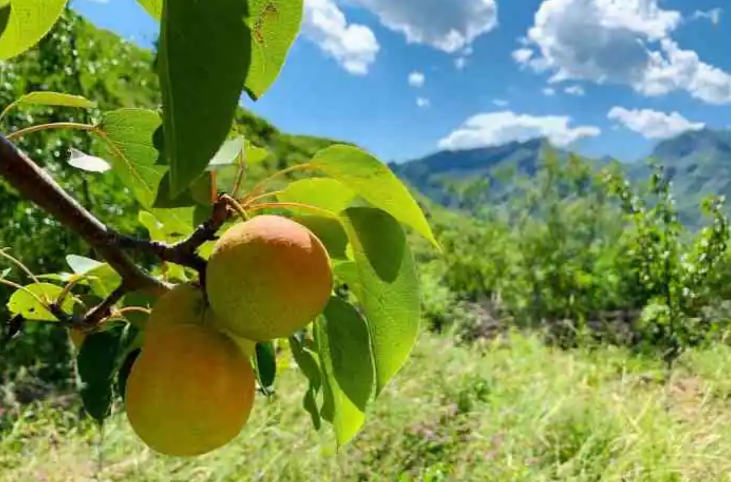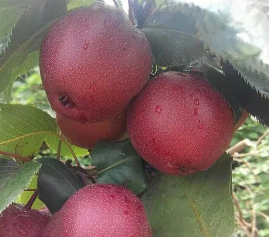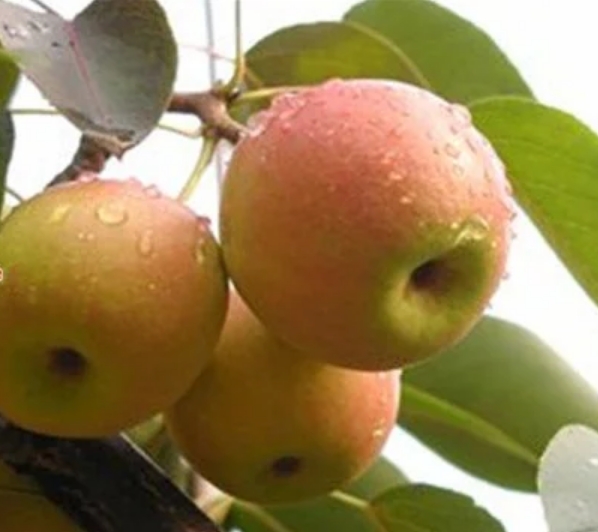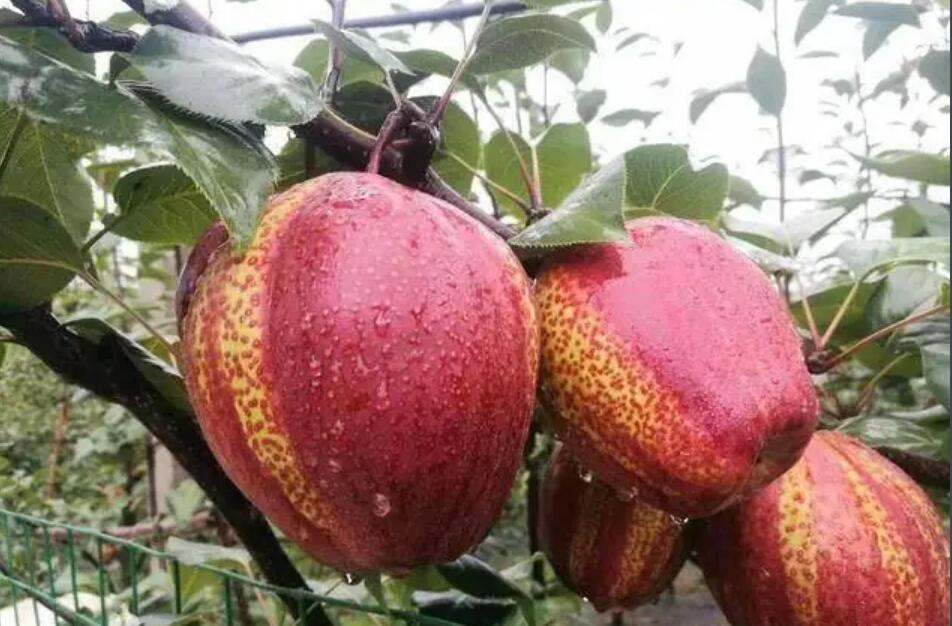 南果梨 形态特征 南果梨幼树枝干呈暗黄褐色,皮孔较稀疏。成年树树皮呈灰褐色,光亮,皮孔长圆形,中大,灰白色,分布不均。芽早熟,叶芽细长,圆锥形,锐尖,有的芽可萌发2~3片簇状副梢。先端芽多贴附着生,下部芽褥凸起,侧芽为明显离生。叶片呈倒卵形或椭圆形,叶端急尖,中大,叶面平整,叶缘具刺毛状齿,较规则;叶色暗绿,光滑,有光泽;叶柄长5~6厘米,微带紫红色,托叶早落。 花芽为混合芽,属伞房花序。顶花芽每朵花序多为8朵,少数为6~7朵;腋花芽每花序多为7朵。花冠较小,为三角形,外翻呈浅绿色。花瓣近椭圆形,边缘比较整齐,蕾期为淡红色,初开为粉红色,盛开时为白色。雄蕊20~25枚,呈两轮着生在粤筒内沿。外轮花丝比内轮花丝略长,花药较小,呈桃红色。花粉稍多。雄蕊柱头3~5枚,一般为4枚,花柱茎部分离,长短不一。 果实扁圆形到近球形。一般纵径为4.7~5.2厘米,横径为5.5~5.8厘米。平均单果重50~75克左右,最大单果重可达170克。果皮中厚,较韧,表面不很光亮,底色多为黄绿色,阳面带有红晕,色泽鲜艳美观。果点较大,近圆形,分布不均。梗洼较小,近于平坦,有沟纹;梗洼较深,比较整齐,花萼多数脱落,少数宿存。果梗短粗,果心较小,果肉乳白色。果实采收后,果肉稍硬,甜脆可食,经10~15天后熟,果肉变黄白色,肉质细,柔软多汁,石细胞少;果皮薄,甜酸适度,芳香浓厚,易溶于口,品质极上。果实耐运输贮藏,在气调冷藏条件下,可贮藏5~7个月。 主要品种 【红色芽变】 南红梨:为南果梨红色芽变,2000年发现于海城市王石镇小女寨村,是1株40余年生南果梨树,所结果实明显红于周围的南果梨。从这株南果梨树上采集接穗进行高接和低接,所结果实也是红的。多年的调查研究证明,该品种果实着色稳定,果皮花青苷含量是南果梨的1.65倍,并保持了南果梨特有的风味与生长结果习性。2011年通过辽宁省非主要农作物品种备案,正式命名为‘南红梨’。 果实圆球形,平均单果重84.6克,大果重175.8克; 【褐色芽变】 褐南果梨:发现于鞍山市原汤岗子牧场1株20余年生的南果梨树上,一个主枝上的果实全部为褐色,果实明显大于南果梨,平均单果重82克,可溶性固形物含量16.5%(显著高于南果梨的15.4%),可滴定酸含量与南果梨相近。贮藏期较南果梨长二三天。其他性状没有发生明显变化。 【大果芽变】 大南果梨:发现于原鞍山鞍钢七岭子牧场1株22年生南果梨树上,一个主枝发生变异,果个大,平均单果重125克(最大214克),比南果梨重40克左右,果形也出现明显变异,呈扁圆形,果型指数为0.83,小于南果梨。部分果面有一二个纵向沟。果皮薄,果肉细,果汁多。可溶性固形物及可滴定酸含量因果个大小而变化。枝条明显粗短,产量高,结果早,抗寒能力略低于南果梨。于1989年经辽宁省农作物品种审定委员会审定,正式命名“大南果梨”。 【红色大果芽变】 大红南果梨最近发现于海城市王石镇小女寨村,为“南红梨”的大果芽变,外形和品质类似“大南果梨”,着色率与“南红梨”相近。正在区试观察中,尚未进行品种备案。 生长环境 南果梨对温度要求不高,在南果梨的主产区——鞍山梨区的年平均气温8.6℃,1月份平均气温-10.5℃,7月份平均气温24.9℃,绝对最高气温36.9℃,绝对最低气温-28.6℃。极抗寒,在-37℃度的条件下无冻害。南果梨喜光,只有在光照充足的条件下才能生长发育良好。 【分布范围】 南果梨主产于中国辽宁省的鞍山海城、岫岩及辽阳地区,在辽宁省朝阳、彰武、锦州、抚顺、本溪、营口等地以及吉林、内蒙古和黑龙江等地区也有少量栽培。 生长习性 【物候期】 花芽萌动期4月上旬,初花期4月下旬,盛花期4月末至5月初。落花期5月上旬。落果期5月中旬至6月上旬。叶芽萌动期待月上、中旬,展叶期为5月上旬。新消生长始期为4月下旬,新消旺盛生长期为5月中旬至6月上旬,新梢停止生长期为6月上旬。6月中旬开始花芽分化。果实采收期为9月上、中旬。落叶期为10月中旬。 【结果习性】 南果梨寿命长,定植后一般4~5年开始结果,8年以后进入盛果期,易丰产。在粗放管理条件下“大小年”结果现象较严重,但若管理良好则丰产稳产性良好,基本没有“大小年”结果现象。 以短果枝和短果枝群结果为主,中长果枝结果为辅,多在3~5年生枝上结果。腋花芽结果能力强,一般生长健壮的植株,腋花芽结实率高达30~40%。短果枝寿命较长,一般达10年以上。坐果能力较高,大部分花序均能坐果,一般每个花序平均可坐2~4个果。南果梨自花结实率低,建园时要选择亲和力较高的品种作为授粉树。 繁殖方法 南果梨生长周期较长,繁殖方式主要是嫁接繁殖。 栽培技术 【建园】 建园过程中,种苗的选择至关重要,为获得高产、稳产,应选择一些长势优越的壮苗来进行建园。按照3米×5米的规格设置南果梨的栽植行距,定植穴按照1米×1米×0.8米的规格进行挖掘,将底土与农家肥按照2∶1比例进行配置,将农家肥15千克施入坑内。定植过程中,将秸秆铺入坑内,厚度为20厘米,之后再进行表土回填。在南果梨根部筑起土台,并将其拍实,之后进行栽植,此时根部与地面相比要略高出一些,沉实后根颈应当高出地面。同时,由于该果树品种具有自花不结果的特性,所以在栽植过程中应当合理设置授粉树,通常依照(3~5)∶1的比例进行设置。对于授粉树的选择,一般选择花粉充足、量多、持续时间长、和南果梨具有很好亲和力的优质品种,如苹香梨或